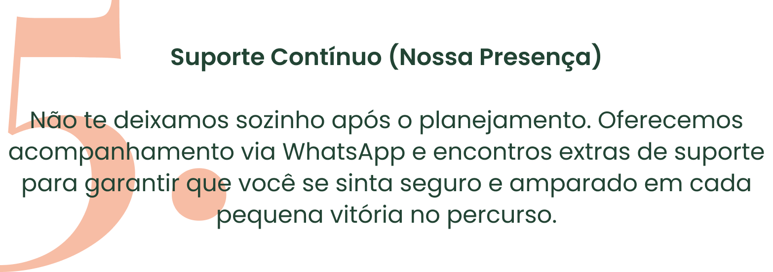 - Atendimento exclusivo e individualizado: Cada etapa do seu plano é pensada para respeitar o seu ritmo e as suas necessidades específicas.