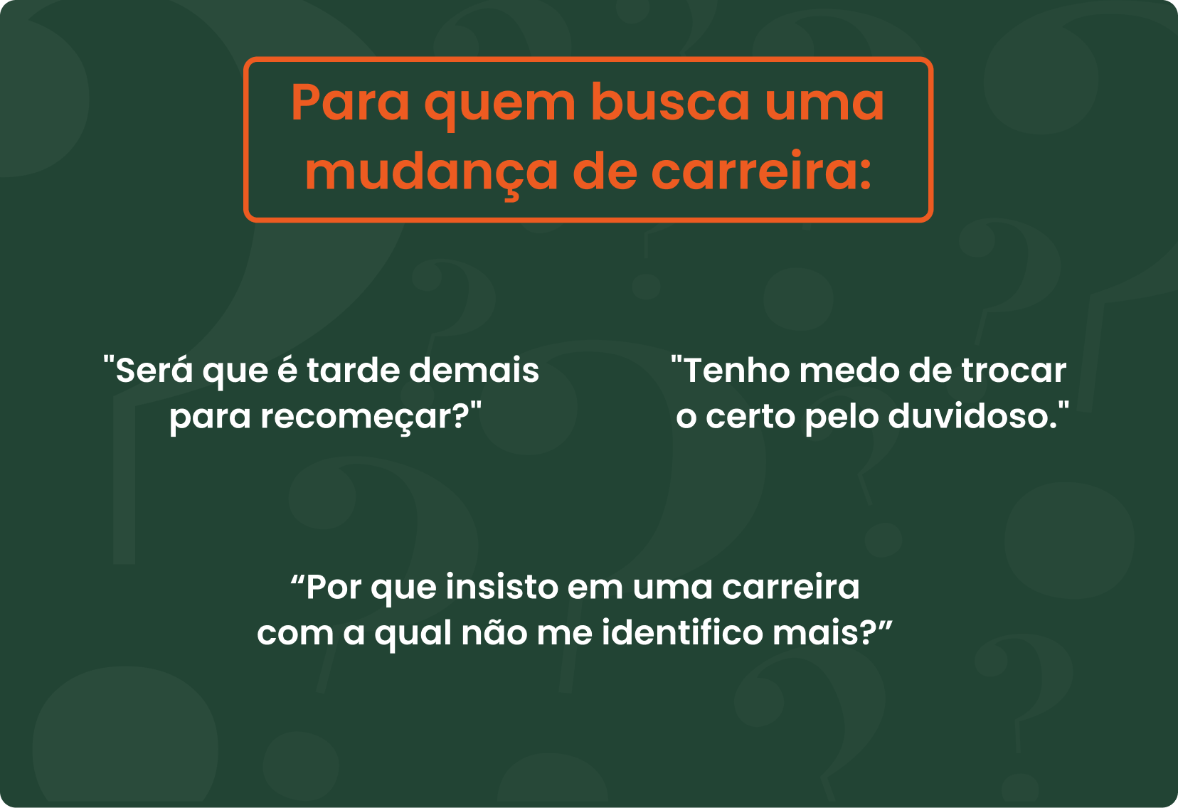 - Planejamento para mudança de carreira: Para profissionais que buscam novos caminhos, mas sentem medo do desconhecido. Oferecemos um planejamento estratégico que substitui a insegurança pela confiança de uma transição consciente e sustentável.