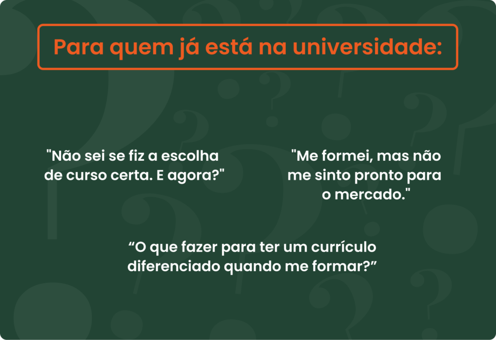 - Mentoria para universitários: Recupere o propósito na faculdade e planeje uma formação acadêmica que realmente faça sentido para você. Ajudamos a resgatar sua motivação e a construir estratégias práticas para sair da graduação com um diferencial competitivo, indo muito além de ser apenas mais um formando no mercado.